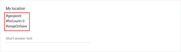 Adding #geopoint to the description will convert a short-answer text question into a GPS location question.